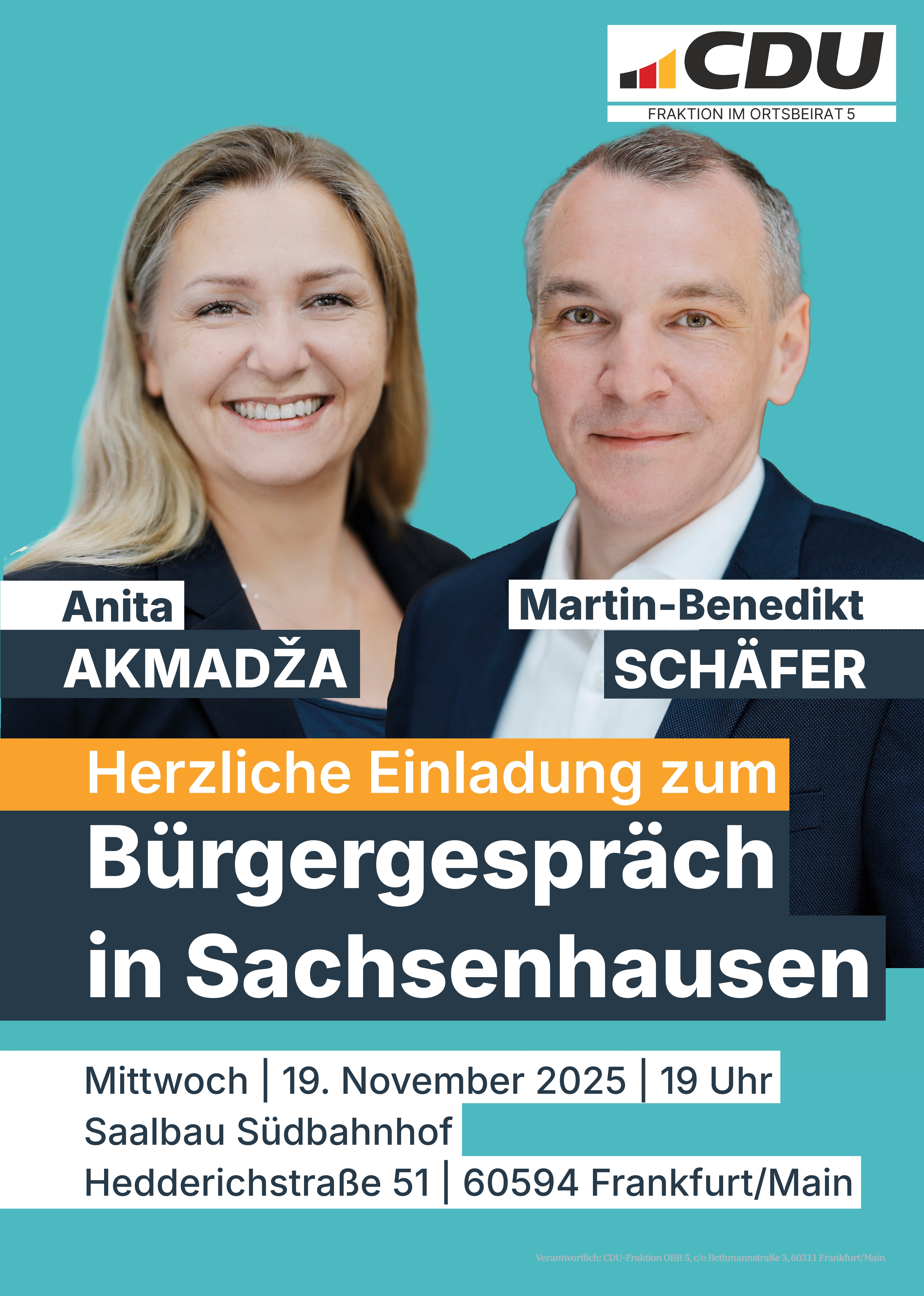 Auf der Webseite der CDU-Fraktion im Frankfurter Süden können Sie mehr über uns und unser politisches Engagement erfahren. Falls Sie Fragen oder Anregungen haben, nutzen Sie gern die angebotenen Kontaktmöglichkeiten. Vielen Dank für Ihren Besuch auf unserer Seite und das Interesse – auf bald!